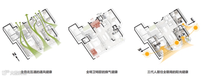 全户型实现了南北通风,四条导风路径强化通风健康;三卫两厨全部实现明厨明卫,可达到自然排风健康;三代全朝南居住空间可获得阳光健康,同时在冬季降低取暖能耗,兼顾健康与环保。
