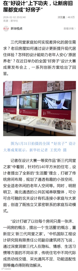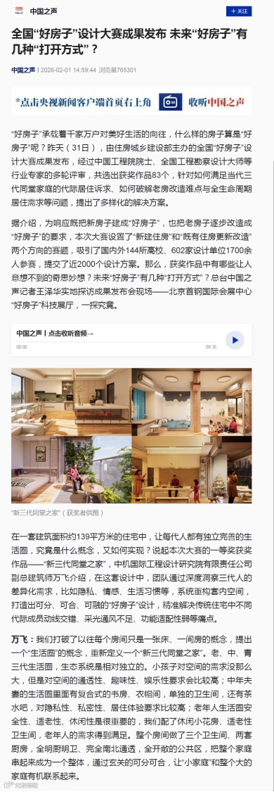 1月31日,由住房城乡建设部主办,中国建筑学会、中国勘察设计协会承办的全国“好房子”设计大赛成果发布会在北京举行。中机国际副总建筑师万飞作品“新三代同堂之家”赢得专业组一等奖,建筑设计研究院副总建筑师杨建锋作品“取一木,还一林;立一屋,守一生”获得大赛优秀奖(另行报道)。本届大赛一等奖全国仅五项,中机国际是除京粤外,唯一获此殊荣的单位。