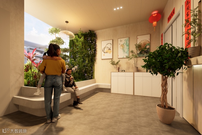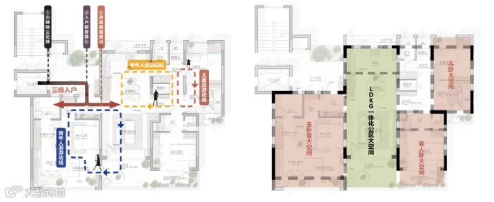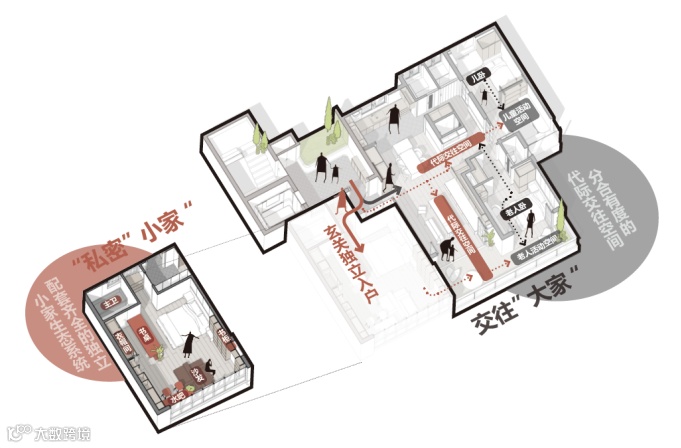通过公共活动空间将独立生活圈进行串联融合,构建“大家+小家”的新家庭模式,“大小家”分而不离,让多代人在家庭中既保留“做自己”的空间,又有和家人互动交往的场所。