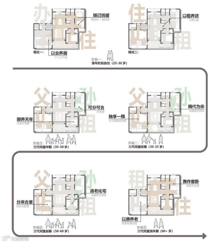 在不改变户型格局的前提下,通过室内空间布局及使用状态调整,适应家庭成员组成和年龄变化对居住空间提出的不同功能要求。从容应对从二人世界到三代同堂,最终回归两人养老的居住演变。