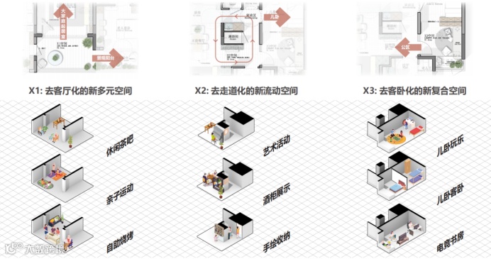 去客厅化的家庭活动空间连接大家庭起居室和景观阳台,发生多种家庭活动,不受空间限制,多样变换;去走道化的艺术展示空间既是过道也是艺术展览、家政收纳的多种空间,人在其中伴随活动的改变而流动;去客卧化的代际居住空间结合儿童卧,在不同家庭结构时分别成为电竞房、书房、儿童活动室、双儿卧、客卧等。