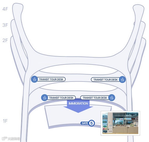 1楼转机观光登记服务台:<入境审查后>5号出口附近,旅客信息台旁