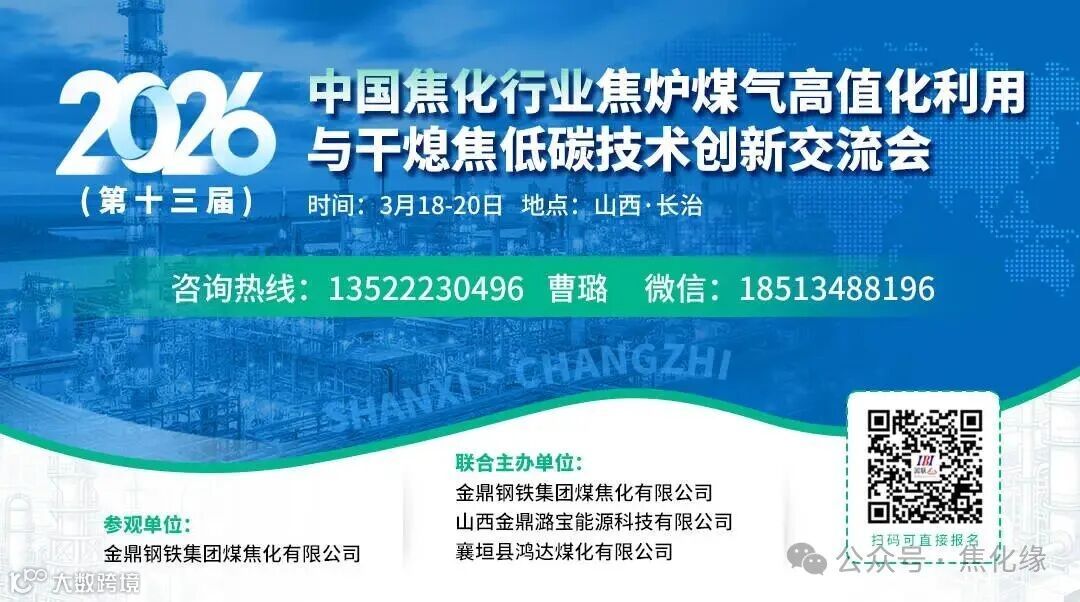 由金鼎钢铁集团煤焦化有限公司、山西金鼎潞宝能源科技有限公司、襄垣县鸿达煤化有限公司联合主办、中化学赛鼎焦化(山西)工程科技有限公司协办的“2026(第十三届)中国焦化行业焦炉煤气高值化利用与干熄焦低碳技术创新交流会”将于3月18-20日在山西长治举办,参观金鼎钢铁集团煤焦化有限公司(潞宝厂区和鸿达厂区);诚邀行业界新老朋友拨冗出席!咨询热线:13522230496曹璐,微信:18513488196