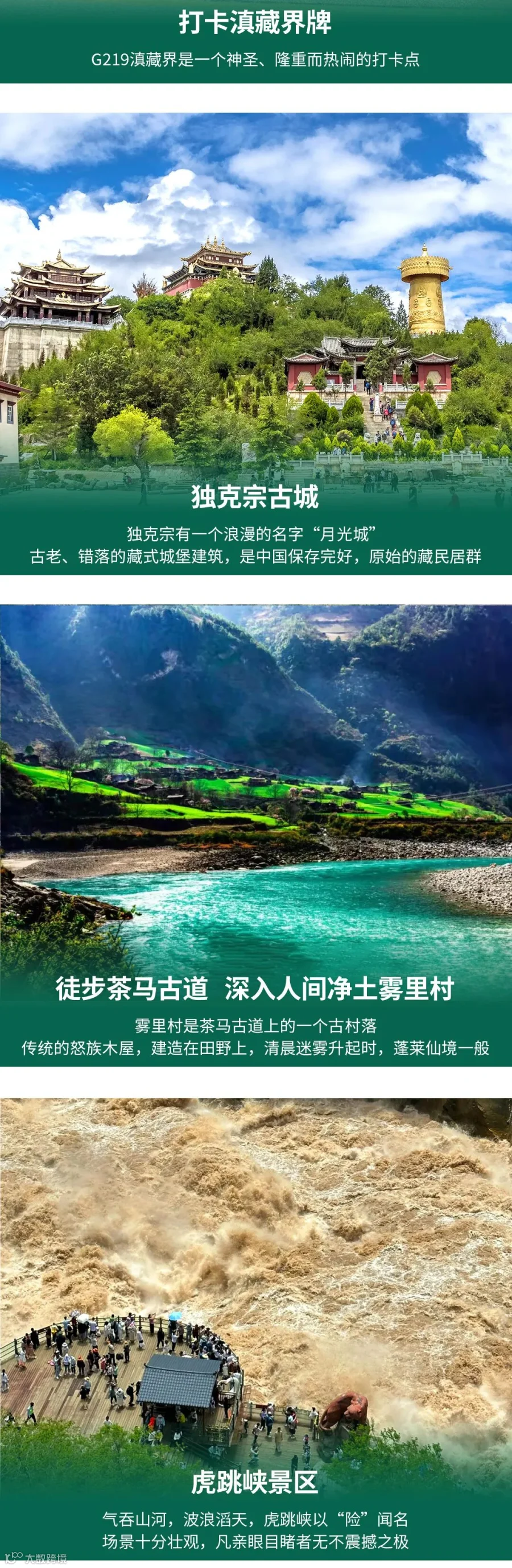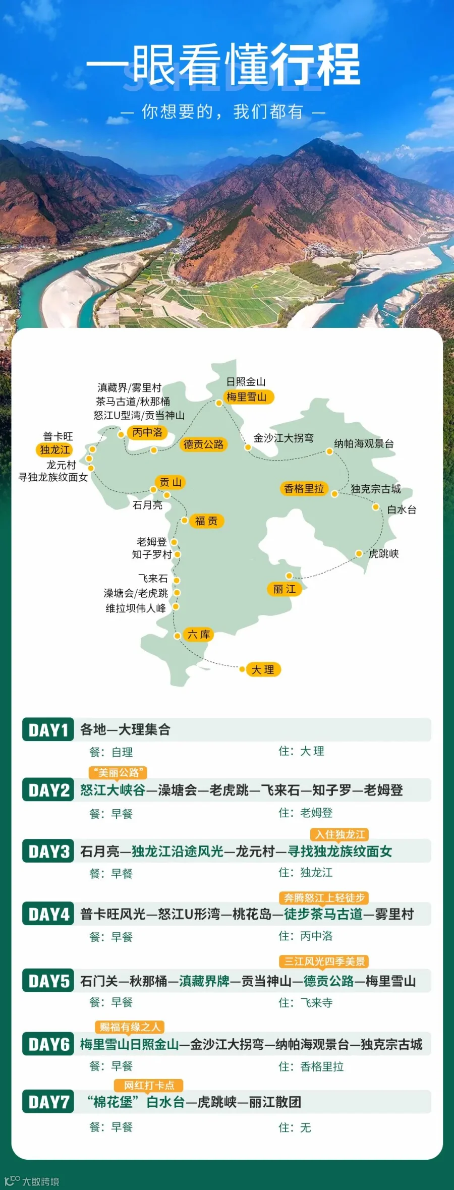 2.如德贡公路因天气或者政策性原因不能进入,则行程更改为:D5:丙中洛-六库,住:六库D6:六库-虎跳峡,住:虎跳峡D7:虎跳峡-中虎跳观景台-哈巴雪山观景台-白水台-丽江解散