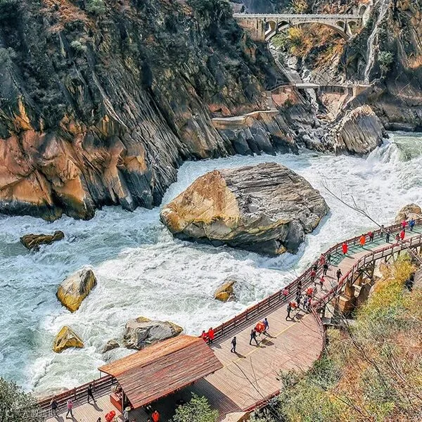 白水台游玩结束后,乘车前往虎跳峡景区游览,虎跳峡金沙江在哈巴雪山与玉龙雪山的夹持,碰撞出汹涌的浪花,惊涛拍岸,奔腾的江水宛如一头咆哮的猛虎,不绝于耳。我们选择其中气势磅礴的一段【上虎跳峡】,相比虎跳峡的其他路段,轻松安全,气势和磅礴却并不逊色。