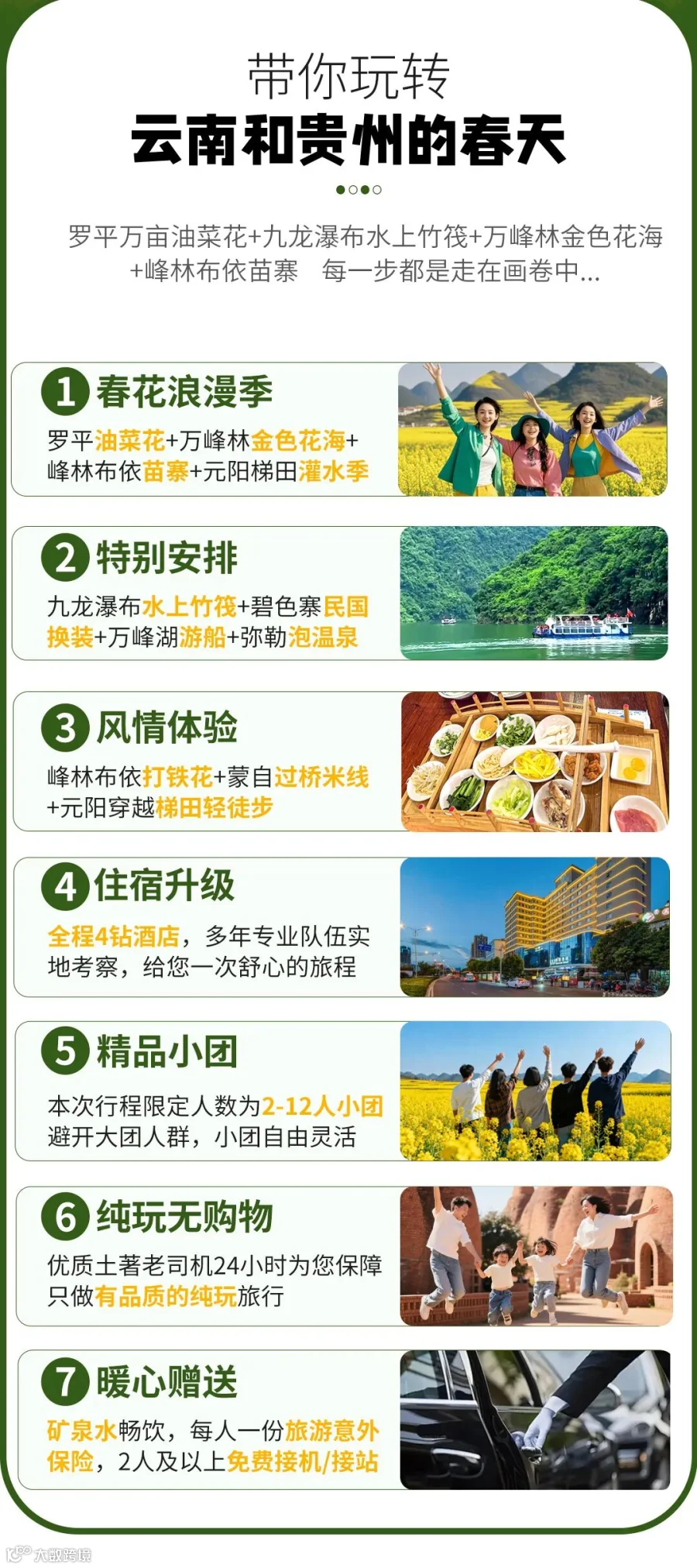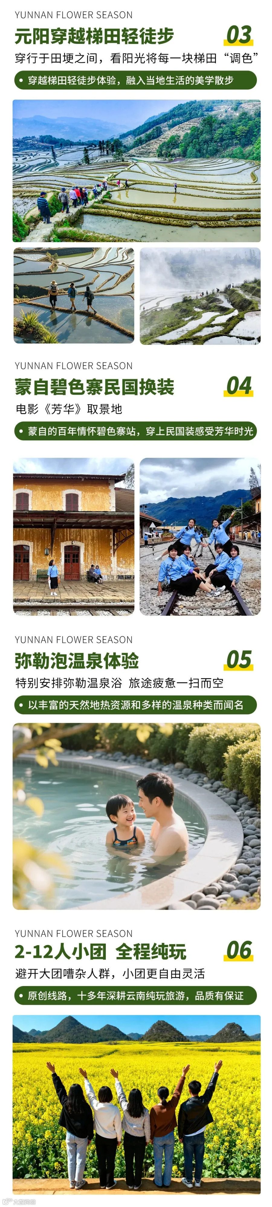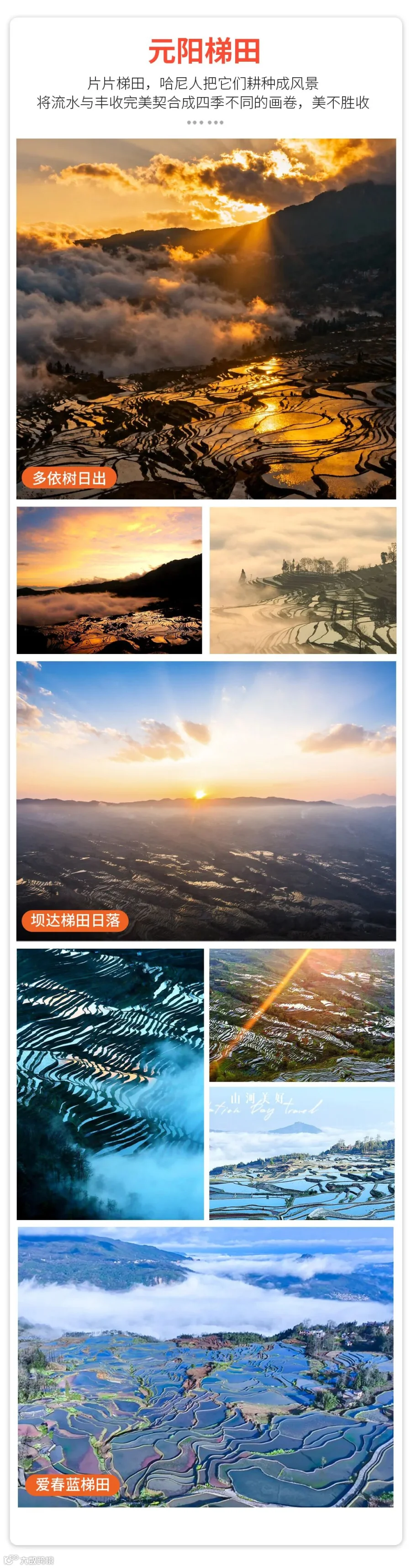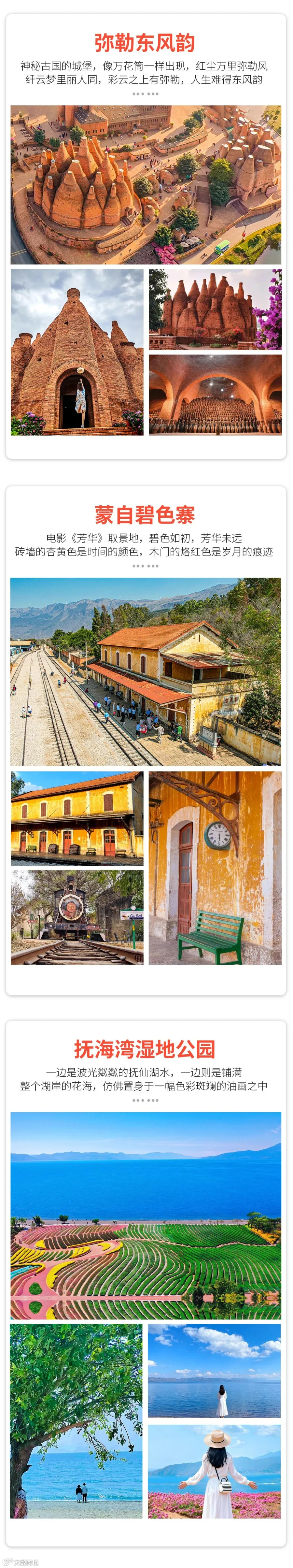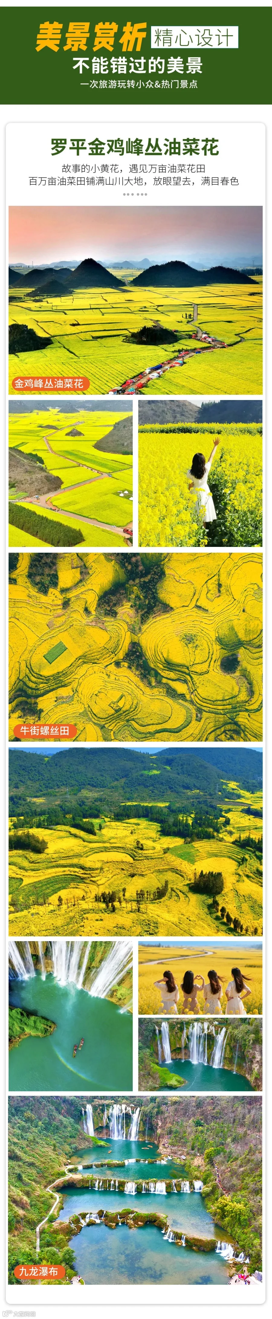 【美景合集】线路风景优美,元素丰富。1)网红秘境全打卡:元阳哈尼梯田+兴义万峰林+罗平油菜花+峰林布依+马岭河峡谷+万峰湖+弥勒东风韵+建水古城+蒙自碧色寨+抚仙湖;2)景点元素丰富:梯田、油菜花田、田园、峰林、古镇、湖泊、铁路、河流、村寨全汇集。