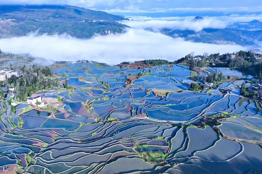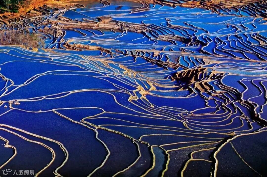 多依树拍摄结束后,我们前往【爱春梯田】被誉为“云端上的蓝宝石阶梯”,一整片天空的蓝,便成了离仙境最近的地方。