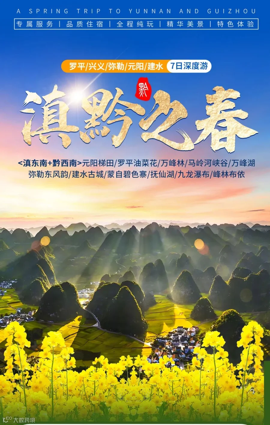 <滇东南+黔西南>元阳梯田-罗平油菜花-兴义万峰林-马岭河峡谷-万峰湖游船-峰林布依-建水古城-弥勒东风韵-碧色寨-抚仙湖-九龙瀑布7天深度游(2-12人精品小团 | 全程4钻酒店 | 水上竹筏 | 过桥米线 | 民国换装 | 布依婚俗巡游 | 元阳梯田轻徒步 | 泡温泉)