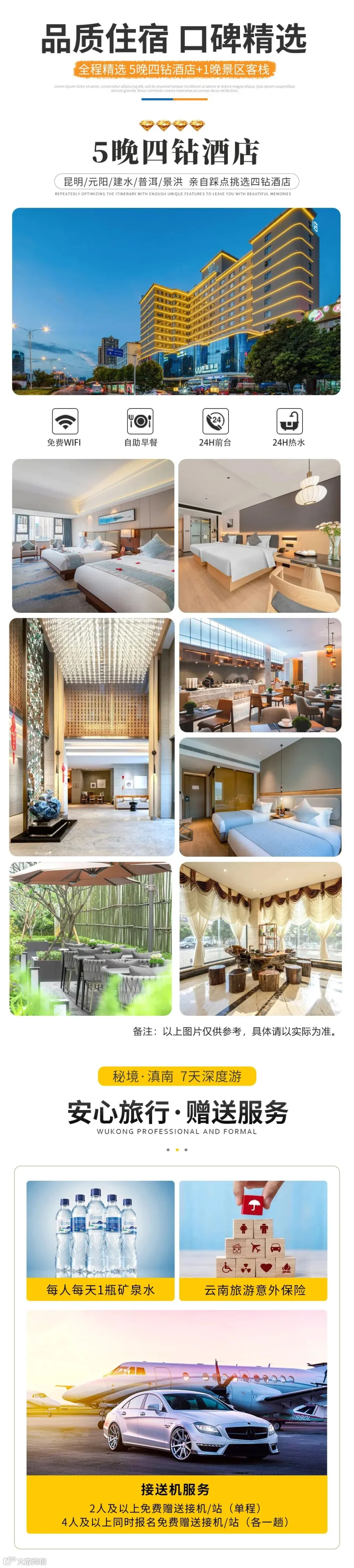 3、住宿:全程6晚住宿(5晚4钻酒店+1晚景区客栈){1晚昆明四钻酒店,1晚建水四钻酒店,1晚元阳四钻酒店,1晚普洱四钻酒店,1晚景迈山景区客栈,1晚告庄四钻酒店}