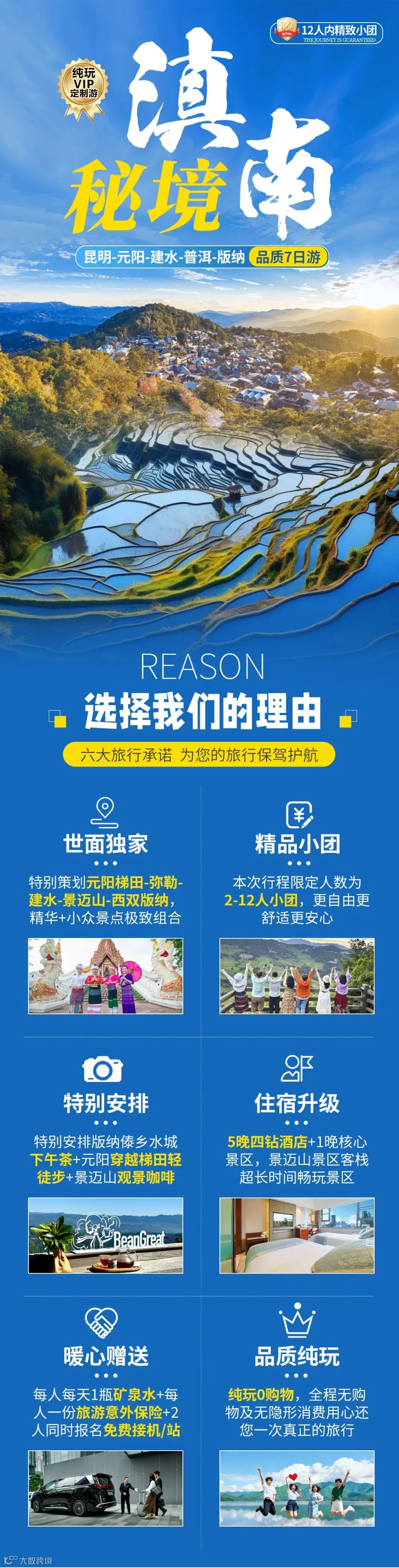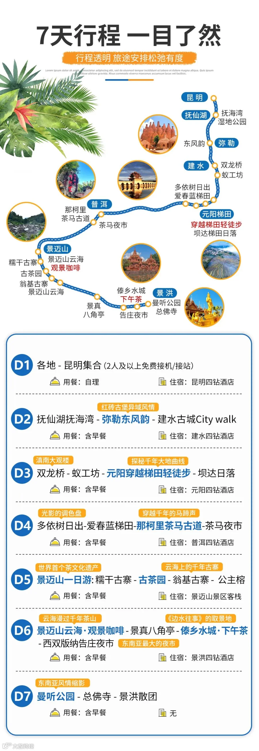元阳梯田 - 弥勒东风韵 - 西双版纳 - 景迈山 - 建水古城 - 普洱那柯里 - 糯干古寨 - 千年古茶园 - 翁基古寨 - 抚仙湖 - 曼听公园 - 傣乡水城7天深度游(2-12人小团 | 5晚四钻酒店+1晚核心景区 下午茶 | 观景咖啡 | 梯田轻徒步)