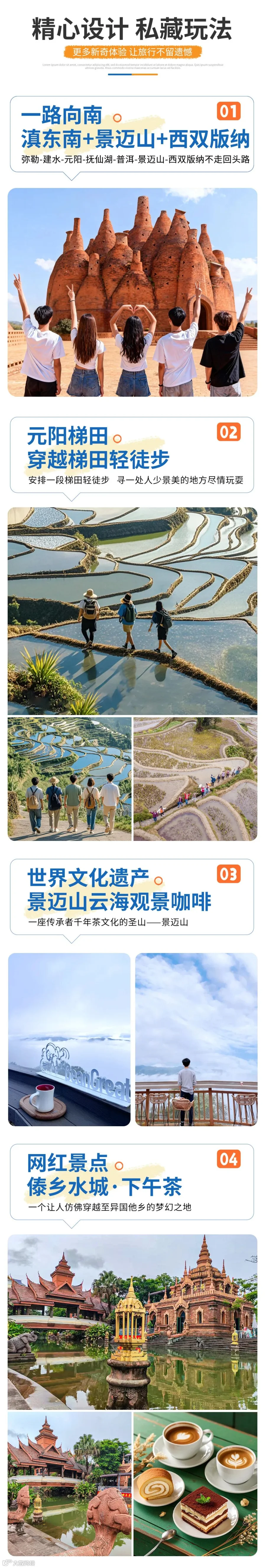 【特别安排】傣乡水城下午茶+景迈山云海观景咖啡+元阳穿越梯田轻徒步,多维度带您体验丰富玩法。