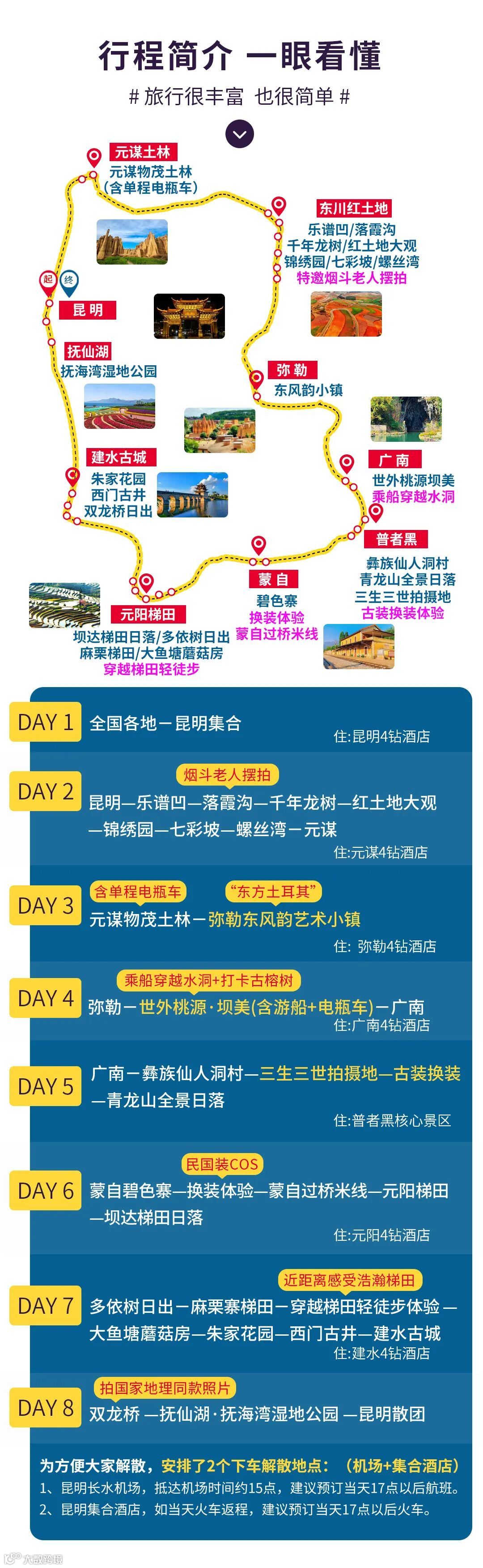 温馨提示:当天抵达昆明时间大概下午15:00左右(先送机场后送集合酒店),建议预订当天17:00点以后航班,17:00以后火车。