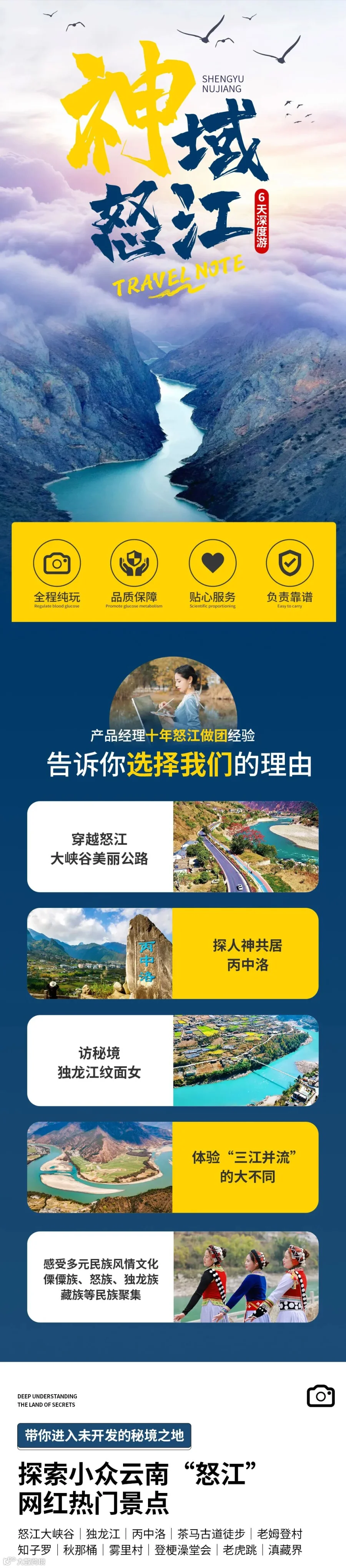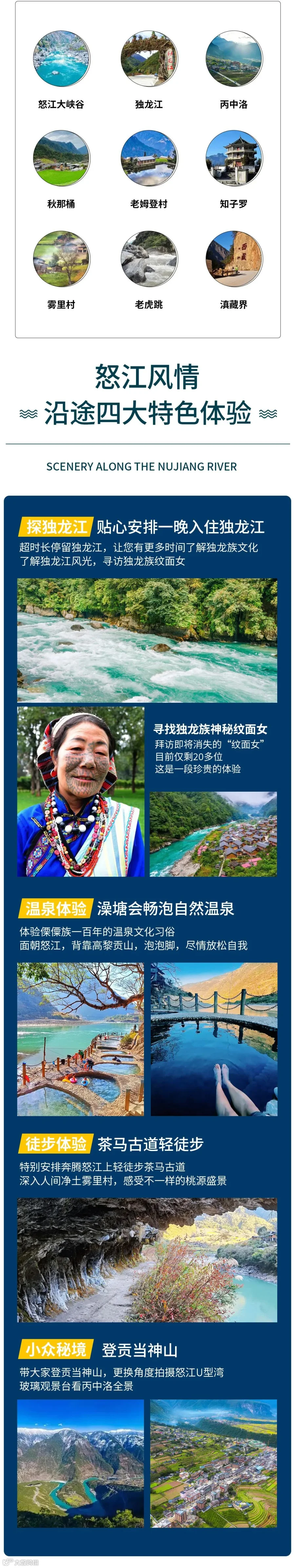 3.如独龙江天气或者政策性原因不能进入,则独龙江更改为“诺邓古城+云龙太极图”,行程对应调整为:D3:老姆登-丙中洛D4:丙中洛-六库,住:六库D5:六库-云龙,住:云龙D6:云龙-大理解散。