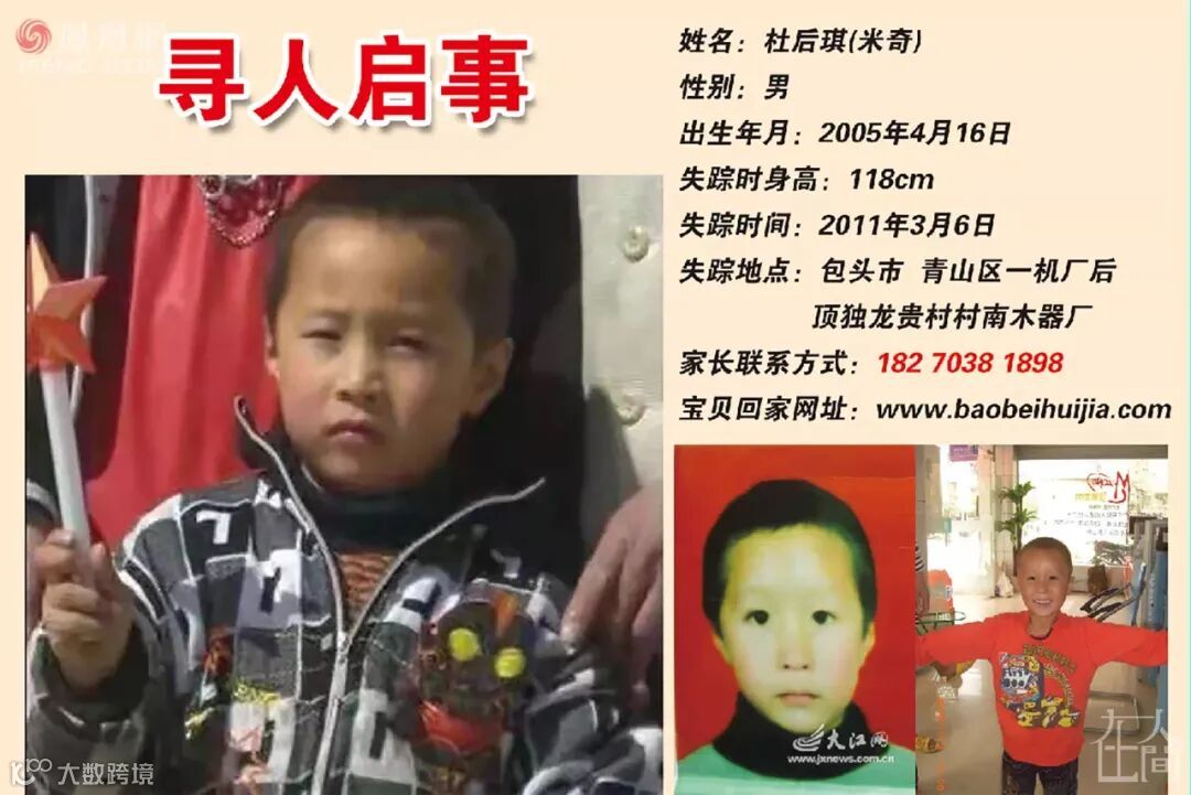 该想的办法想了,该找的地方也找了。夫妻俩还自费在出租车、广播电台上轮播《寻人启事》,请广大市民留意:“杜后琪,乳名小米奇,男,2005年4月6日出生,江西省上饶市玉山县怀玉乡(童坊)白泥村,身高1.18米左右,体型偏瘦,脸型稍长,双眼皮,眼睛略小,淡淡的眉毛,睫毛特别长,鼻梁上有一块旧伤疤,右眼角有一块新伤疤。耳朵紧靠后脑勺,皮肤略黑,说普通话,性格调皮但胆子小。于2011年3月6日在内蒙古包头市青山区一机厂后顶独龙贵村南村木器橱柜厂门前失踪,送小孩回家者当面酬谢20万元。”