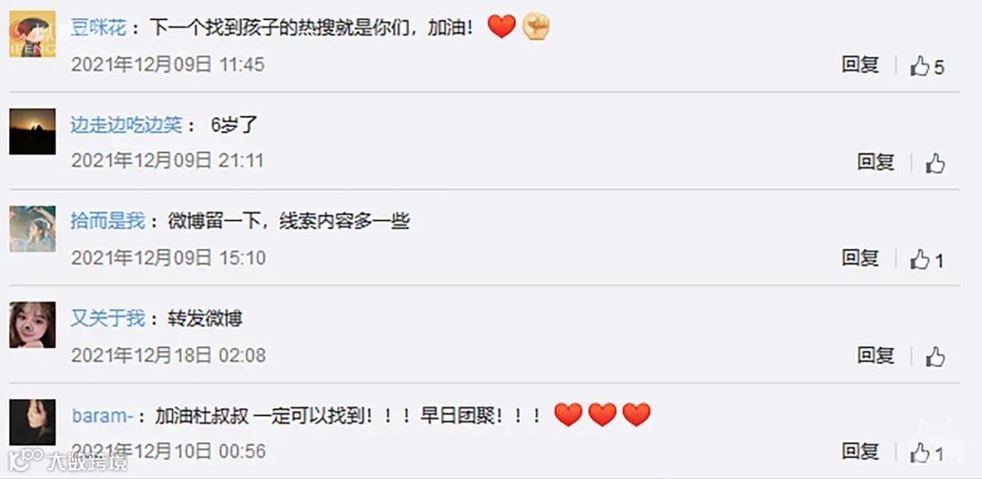 2021年初,公安系统开展“团圆行动”以来,打拐专家通过人脸识别技术、DNA比对技术,再结合多年的实战经验,孩子们陆续回家了:7月,《失孤》原型郭刚堂找到了儿子郭振;12月,孙海洋找到了孙卓。随着孙海洋事件的不断发酵,除了媒体关注,在微博这样的社交媒体平台,讨论被拐儿童的相关话题也频频登上热搜。社会关注的重点,从孙海洋一家转移到了更多寻子家庭身上。灰心的杜小华有了盼头,“感觉孩子在回家的路上。”更有网友评论,“下一个找到孩子的热搜就是你们。”