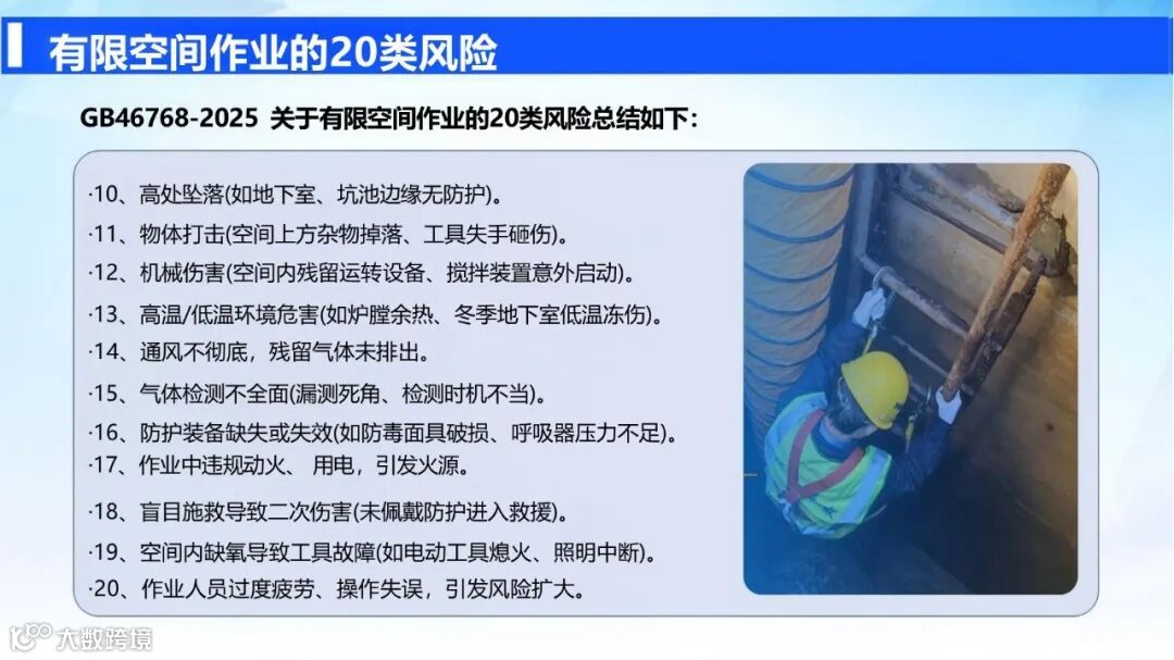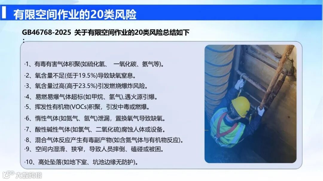 有限空间作业因空间封闭、通风不良、风险隐蔽等特点,易引发中毒窒息、爆炸燃烧等安全事故,是安全生产管理的重点和难点领域。本总结结合《工贸企业有限空间作业安全规定》(应急管理部令第13号)、《有限空间作业安全技术规范》(GB 46768—2025)等最新法规标准,从核心定义、管理体系、全流程管控、应急处置及新规要点等方面,梳理关键安全管理知识,为作业安全提供指引。