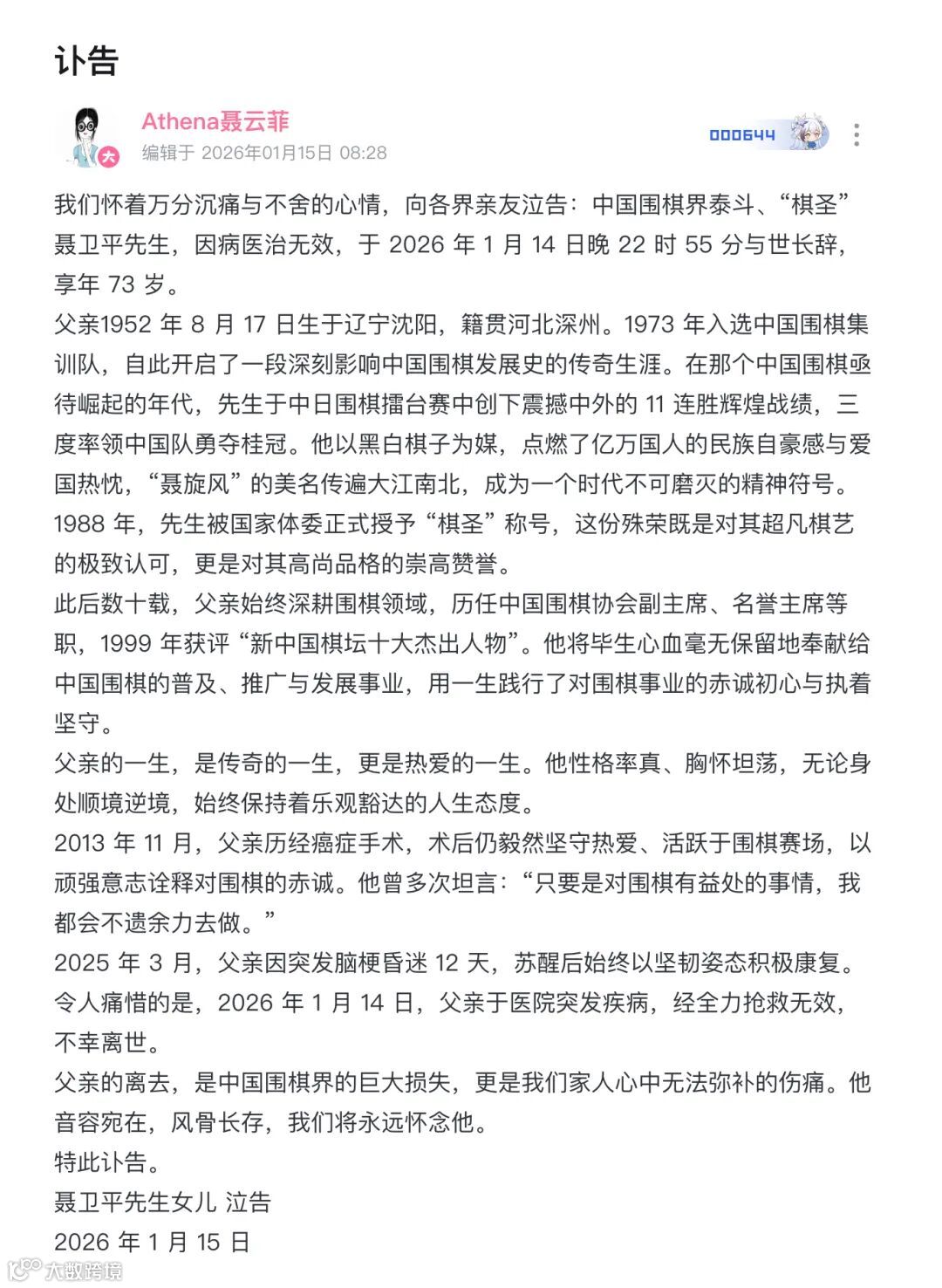 1月15日,“棋圣”聂卫平之女聂云菲发布讣告:聂卫平先生因病医治无效,于2026年1月14日晚22时55分与世长辞,享年73岁。