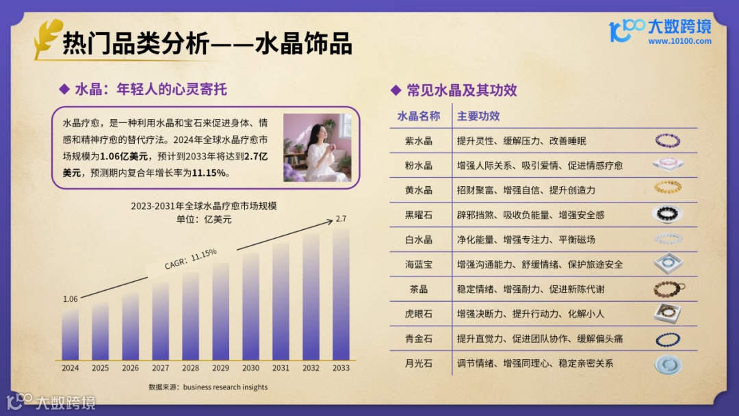 水晶市场正在经历从珠宝到泛灵性市场的消费升级,Z世代将水晶视为“情绪自救工具”,水晶手串、水晶摆件等产品凭借“能量调节”的卖点成为海外社媒流量担当。