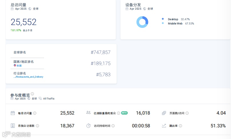 数据显示,该站点在近一个月的访问量达到25,552次,同比增长81.97%,其中92.25%的流量来自美国本土,主力受众十分集中。