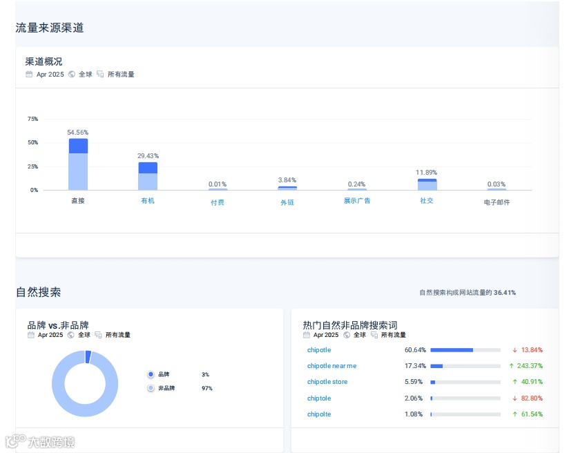 自然搜索贡献36.41%,关键词多为“chipotle”或“chipotle store”,说明主品牌为独立站持续引流。