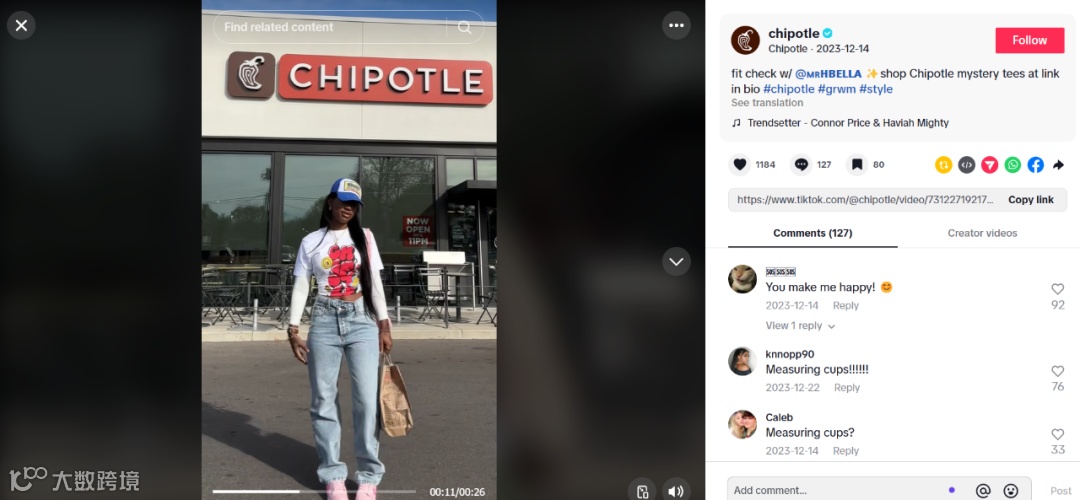 图源:Tiktok相比动辄几万美元的明星代言,Chipotle 更倾向合作中小型生活方式博主,走“接地气+性价比”路线。