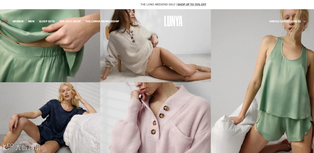 图源:LunyaLunya是由Ashley Merrill于2014年成立的美国睡衣品牌。2012年,Ashley Merrill因注意到市场缺乏舒适且适合女性居家的睡衣,创立Lunya品牌,满足现代女性对舒适、优质及时尚睡眠服饰的需求。