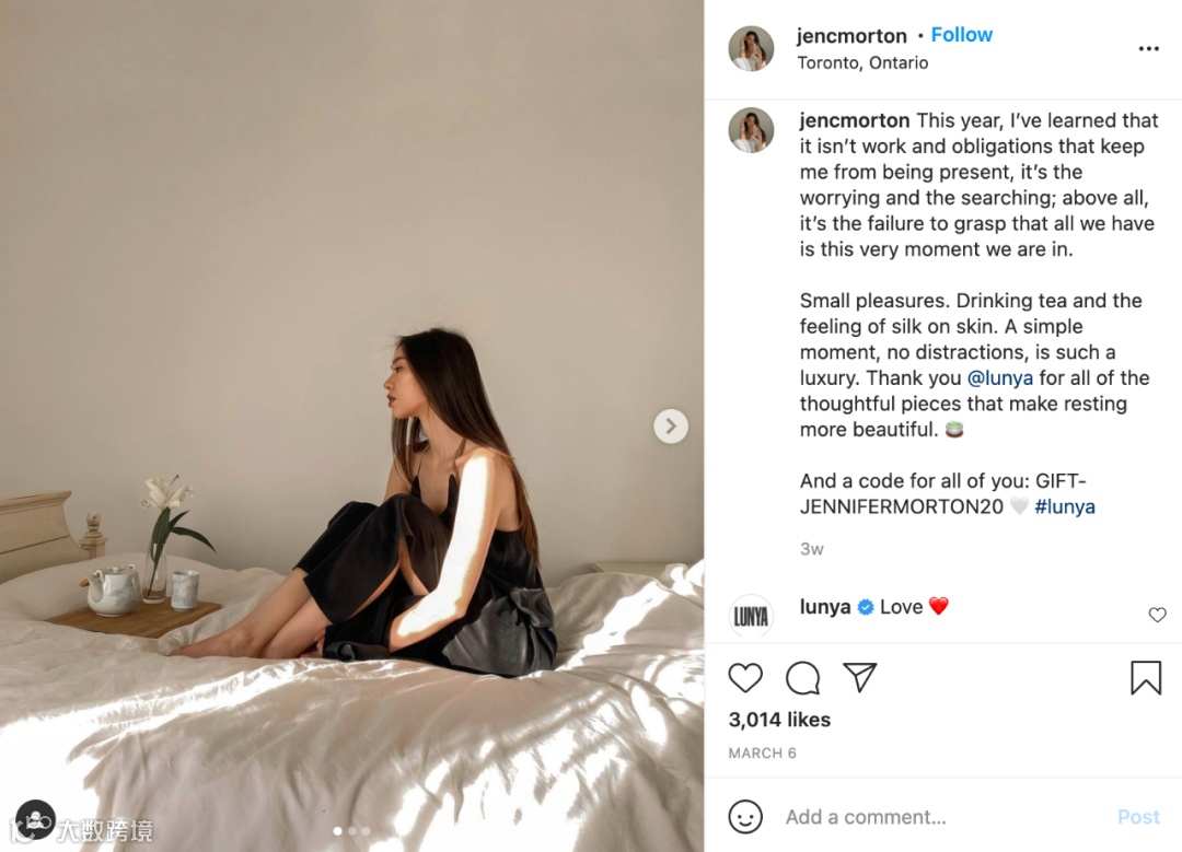 图源:Instagram营销推广方面,Lunya初期与家居、生活穿搭、日常生活等中小垂类网红合作,以联盟分销的方式,设定KOL佣金,红人在社媒平台发布品牌活动促销、新品测评、家居服饰分享类视频,垂直种草至精准用户,扩大品牌曝光,达成流量裂变,提高营收。