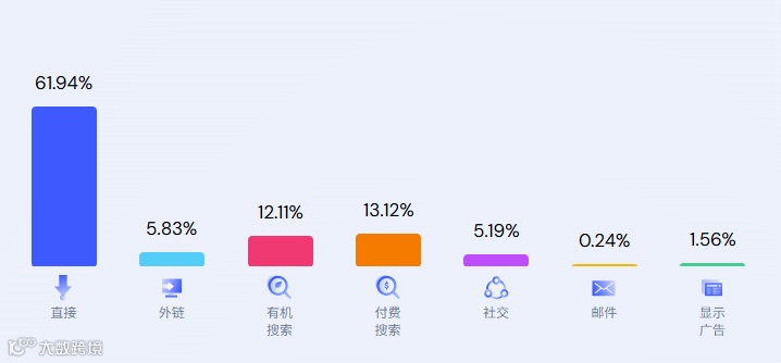 图源:similarwebLunya流量来源分析显示,直接流量占61.94%,有机搜索占12.11%,付费搜索、外链、社交等分别占13.12%、5.83%、5.19%。其中从Facebook获得了最多的社交媒体流量,占43.61%,其次是Instagram和Reddit,分别占42.82%、13.57%。