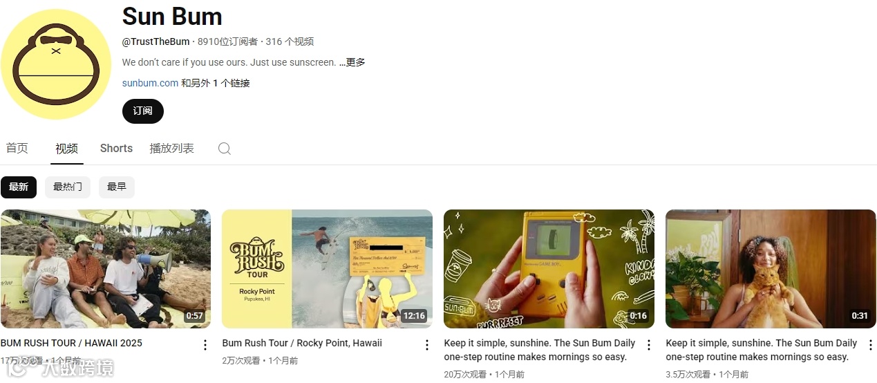 此外,Sun Bum的视频,大多都控制在2到5分钟以内,这会更适合移动端浏览和社媒二次传播,是有助于增加品牌曝光效率与分享意愿的。