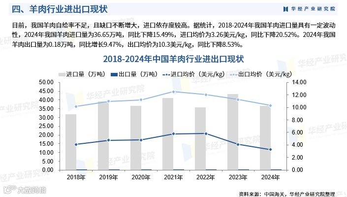 当前我国羊肉自给率偏低,供需缺口呈扩大趋势,进口依赖度较高。2018至2024年期间,羊肉进口量波动运行,2024年进口量为36.65万吨,同比下降15.49%;进口均价为3.26美元/kg,同比下降20.52%。同期出口量为0.18万吨,同比增长9.47%,出口均价为10.3美元/kg,同比下降8.53%。