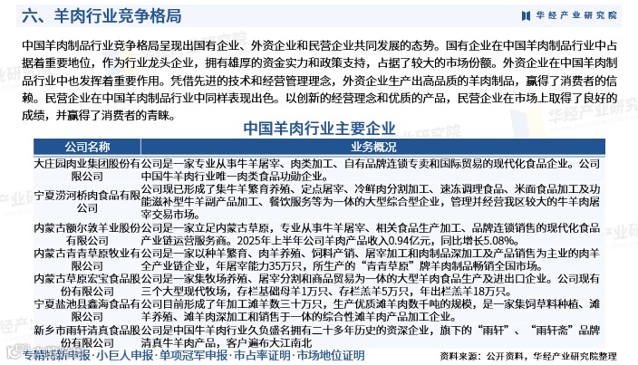 对内蒙古小肥羊、大庄园肉业、蒙都羊业、锡林郭勒盟羊羊牧业、额尔敦羊业等代表性企业进行基本情况、产品结构、经营状况及竞争力分析。