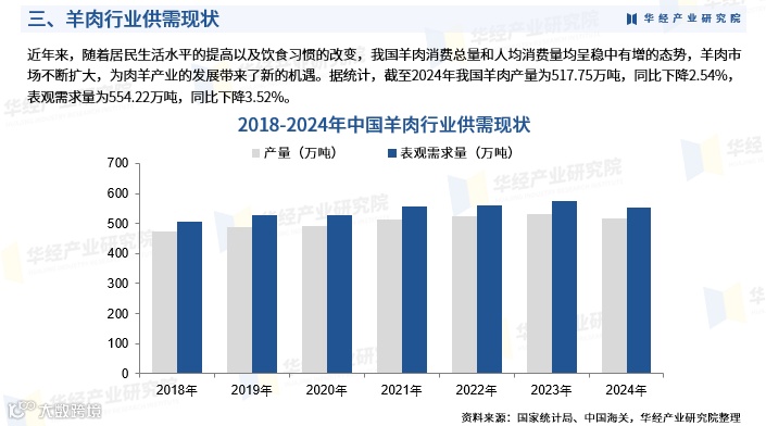 近年来,随着居民生活水平提升和饮食结构优化,我国羊肉消费总量和人均消费量保持稳中有增态势,市场规模持续扩大,为肉羊产业发展带来新机遇。数据显示,2024年全国羊肉产量达517.75万吨,同比下降2.54%;表观需求量为554.22万吨,同比下降3.52%。