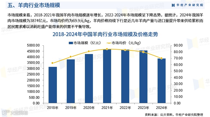 市场规模方面,2018至2021年我国羊肉市场持续增长,但2022年以来进入调整期,规模有所回落。2024年市场规模为3874亿元,市场均价约69.9元/kg。价格下行主要受产量增加与进口量上升导致供给累积,而消费需求增长乏力,供需失衡所致。