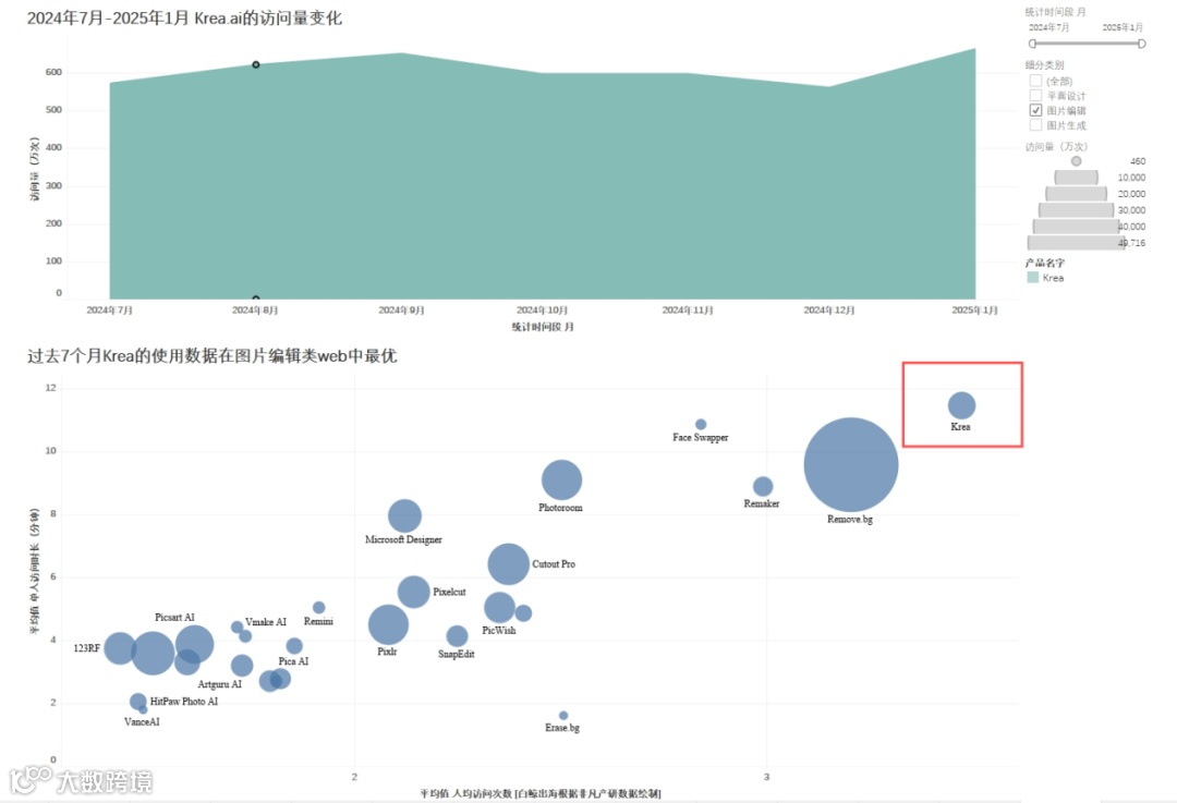 拿下本月增速 Top5,对 Krea 来说非常难得。Krea 的使用数据(单次访问时长和人均访问次数)很好看,但流量一直持平、甚至 2024 年下半年略有下滑。2025 年 1 月发了在图像中实时生成 3D、以及低门槛 Avatar 定制训练的功能之后,被大量创作者讨论,终于迎来 18.24% 的环比增幅。(而 Krea 在“长相”大同小异的图片赛道中,是一款很有自己思考和定位的产品,其独特的产品交互设计及基于独特交互实现的精准控制,保障了用户粘性并在近一个月里尝试不断破圈,本周我们会专门针对 Krea 发布一个选题,感兴趣的读者可关注)