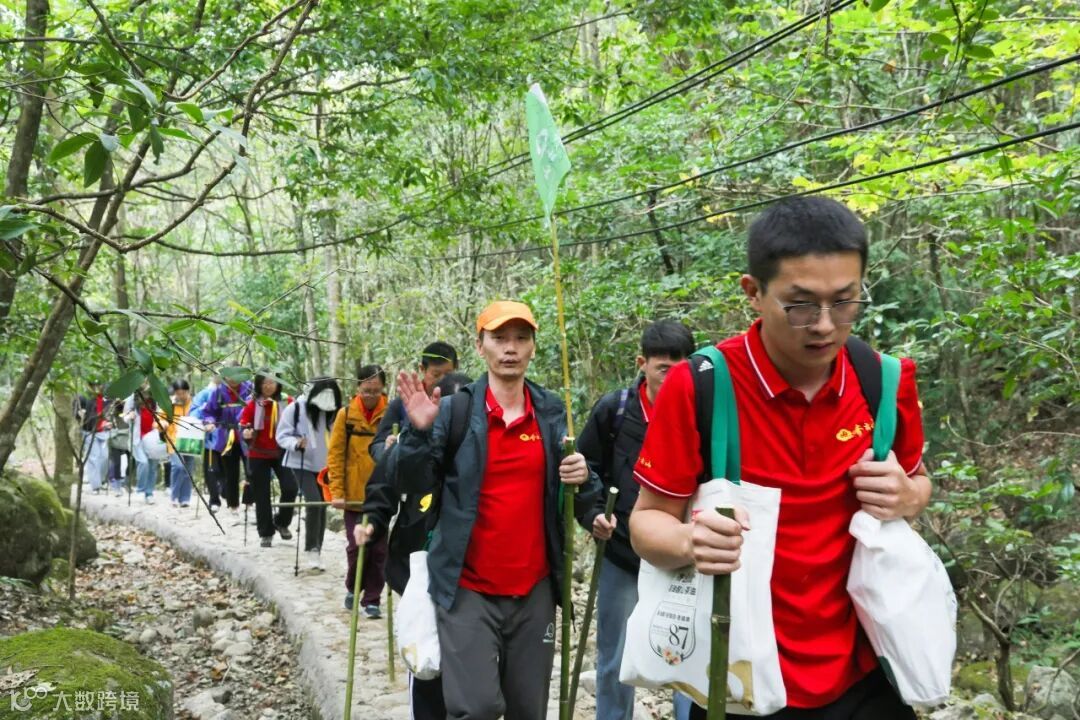 远离尘嚣,贪婪的呼吸着大自然赐予的清新空气。远处树木郁郁葱葱、层层叠叠、生机勃勃。浩浩荡荡的登山队伍蜿蜒曲折,队员嬉笑玩闹开着玩笑。快乐溢出屏幕。