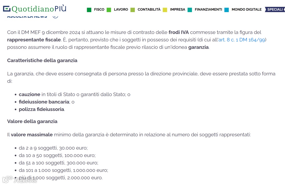 2.意大利担保金额与税务代表为卖家提供的服务数量直接相关,具体金额如下: