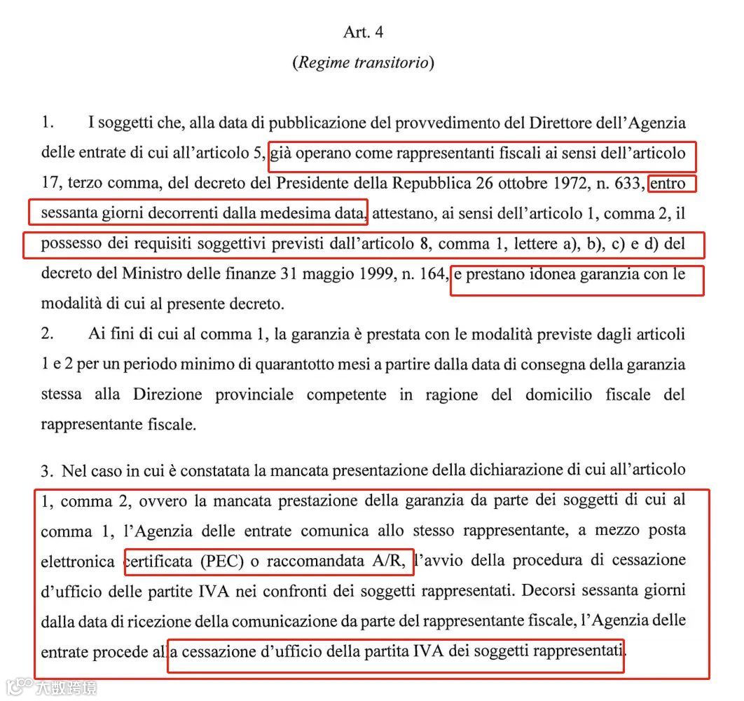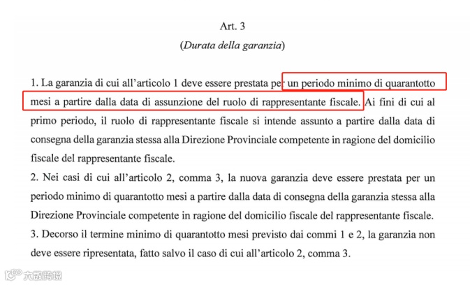 意大利税局要求,在该法令颁发前已是税务代表需自公布之日起,“60天”内需提供担保。