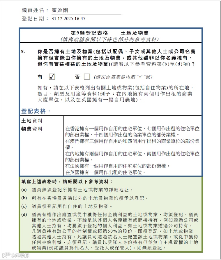 霍启刚的这份申报单,堪称豪门资产公开的“教科书”。按香港立法会《议事规则》第83条要求,他不仅完成基础申报,更主动披露了远超合规标准的细节,妥妥的“全球包租公”配置。