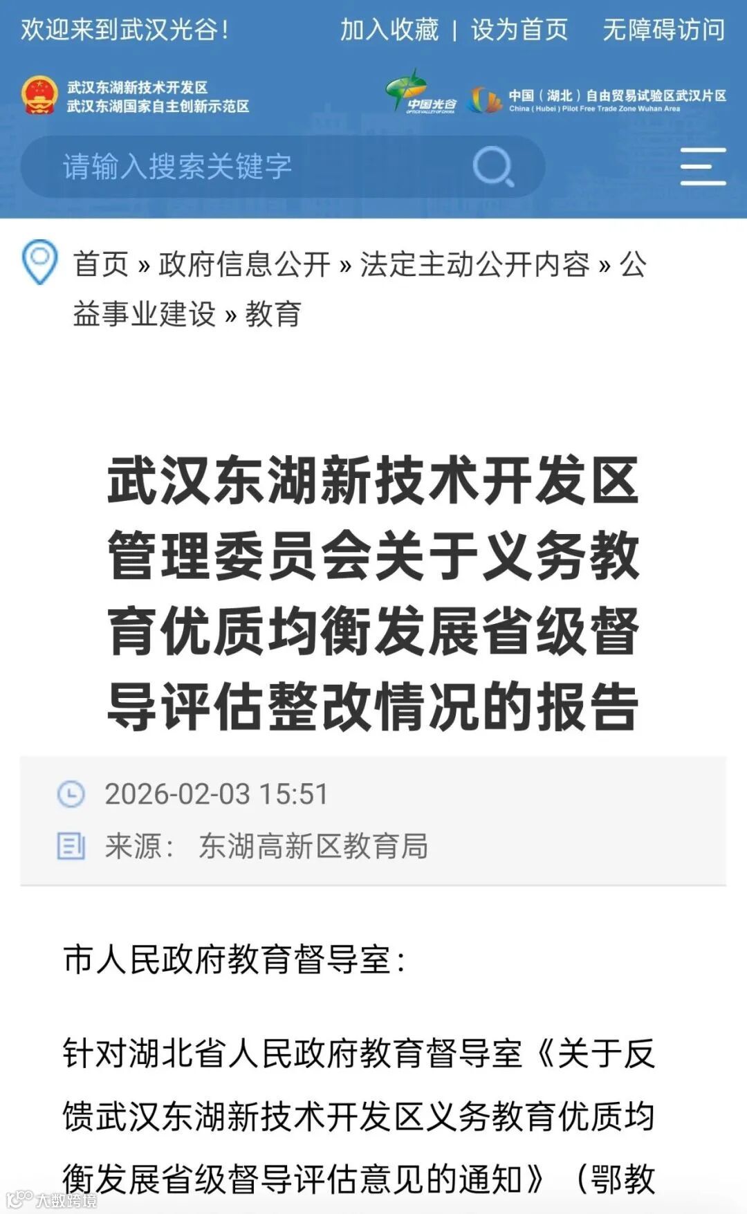 2 月 3 日,东湖高新区官网发布《武汉东湖新技术开发区管理委员会关于义务教育优质均衡发展省级督导评估整改情况》的报告。