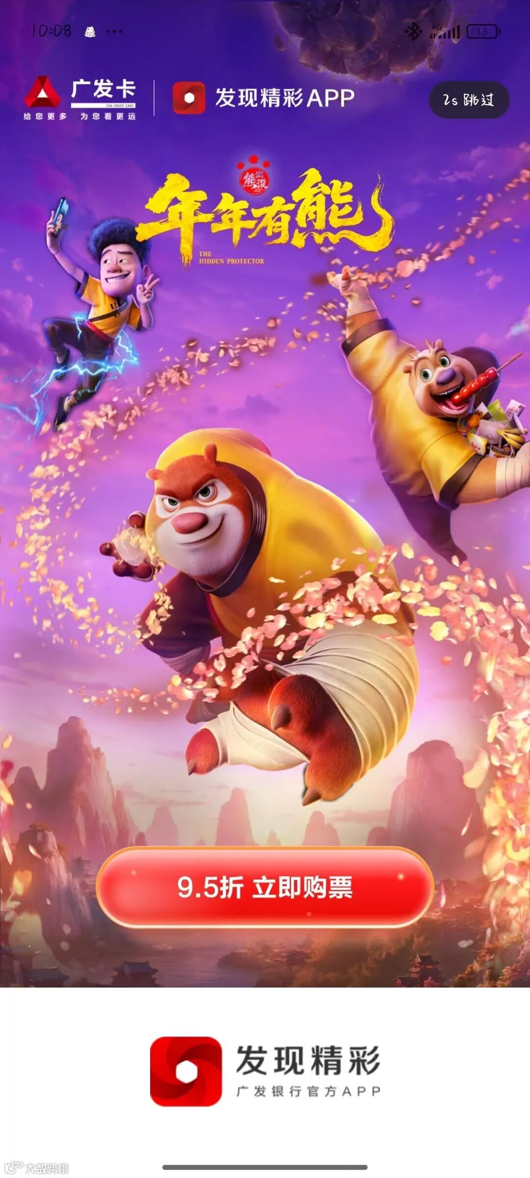 用广发银行APP购买《熊出没·年年有熊》电影票,解锁9.5折优惠惊喜。