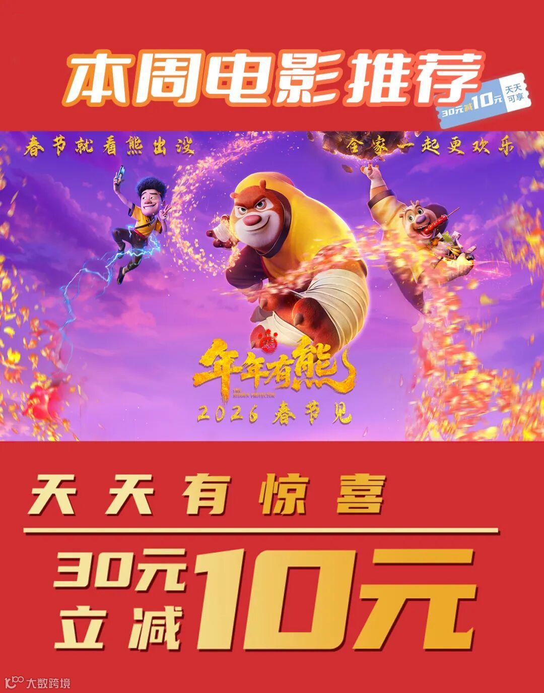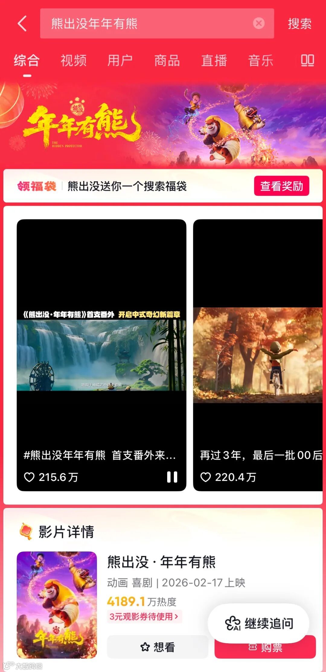 2026年2月10日至2026年2月28日,用户通过抖音App、抖音极速版App、抖音火山版App任一渠道,搜索【熊出没·年年有熊】发现搜索福袋,点击【领券购票】即有机会领取选座购票优惠券。