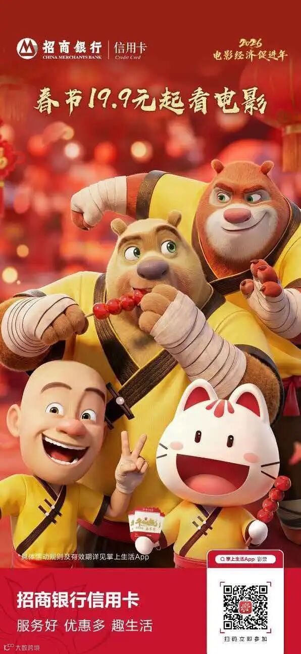 2026年2月13日至23日,招商银行个人信用卡持卡用户在掌上生活App搜“影票”购买电影票,可享“19.9元起观影”活动,每天上午10点开抢。数量有限,先到先得。
