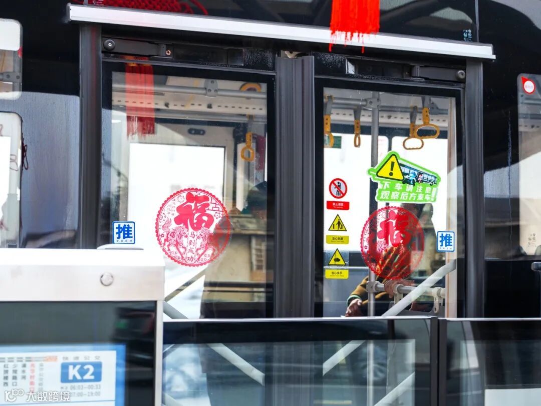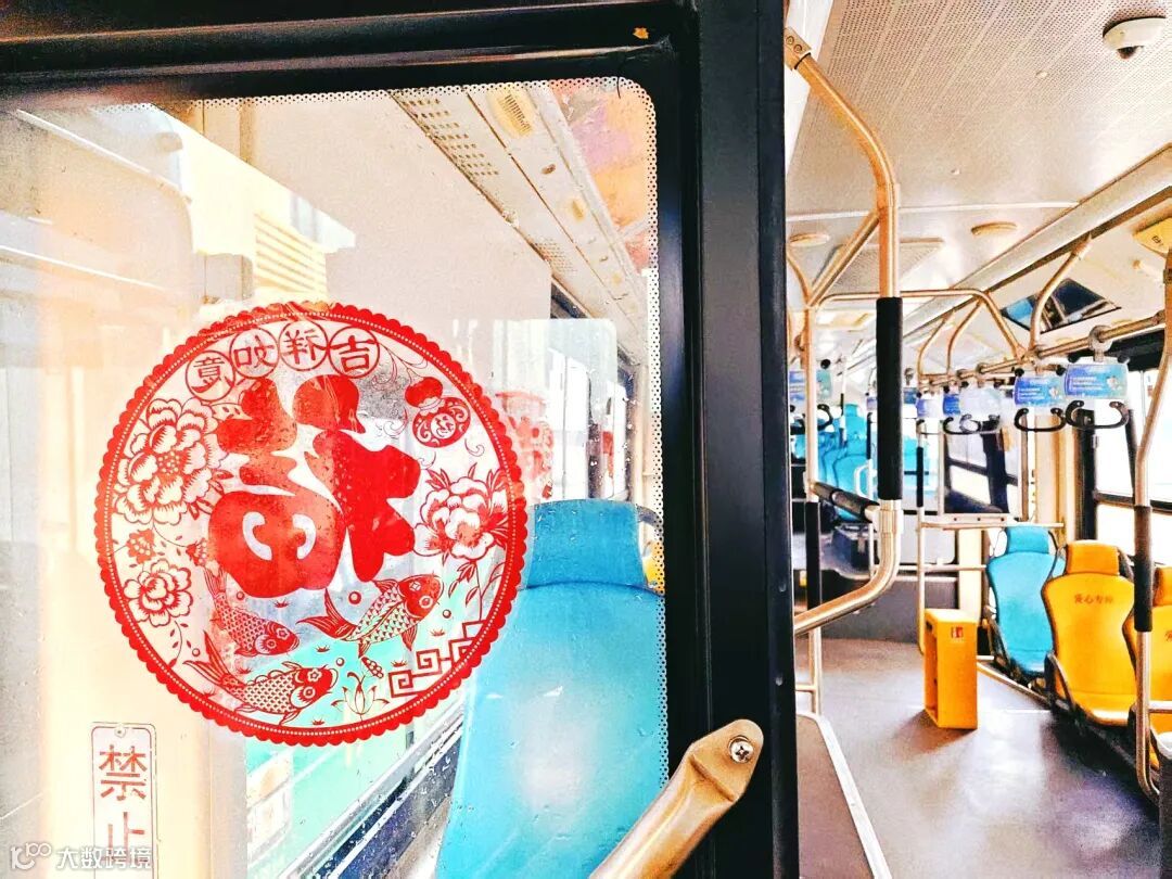 公交车窗内外,喜庆连成一片