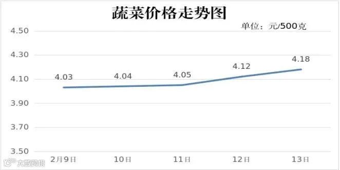 三、蔬菜价格有所上涨。春节临近,批发环节囤货、居民家庭备货量显著增加,终端需求提振明显,带动蔬菜价格整体上涨。2月13日,重点监测的16种蔬菜平均价格为4.18元,周环比上涨3.72%,同比上涨1.95%。