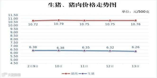 一、猪肉价格略有上涨。生猪出栏量整体充足,市场供应宽松,压制生猪价格;春节前居民集中采购,猪肉终端需求阶段性回升,支撑猪肉价格小幅上涨。2月13日,生猪(每500克,下同)平均价格6.26元,周环比下降1.88%,同比下降22.52%;猪肉(去骨后腿肉)10.76元,周环比上涨0.37%,同比下降16.13%。