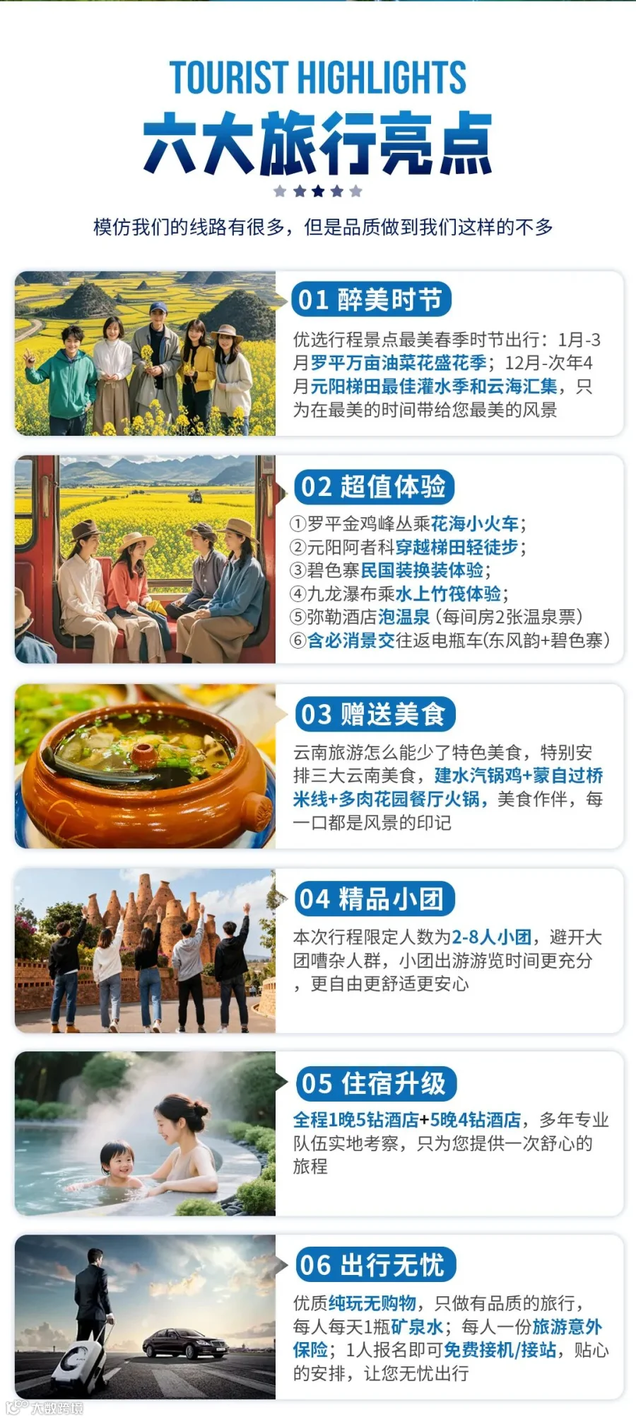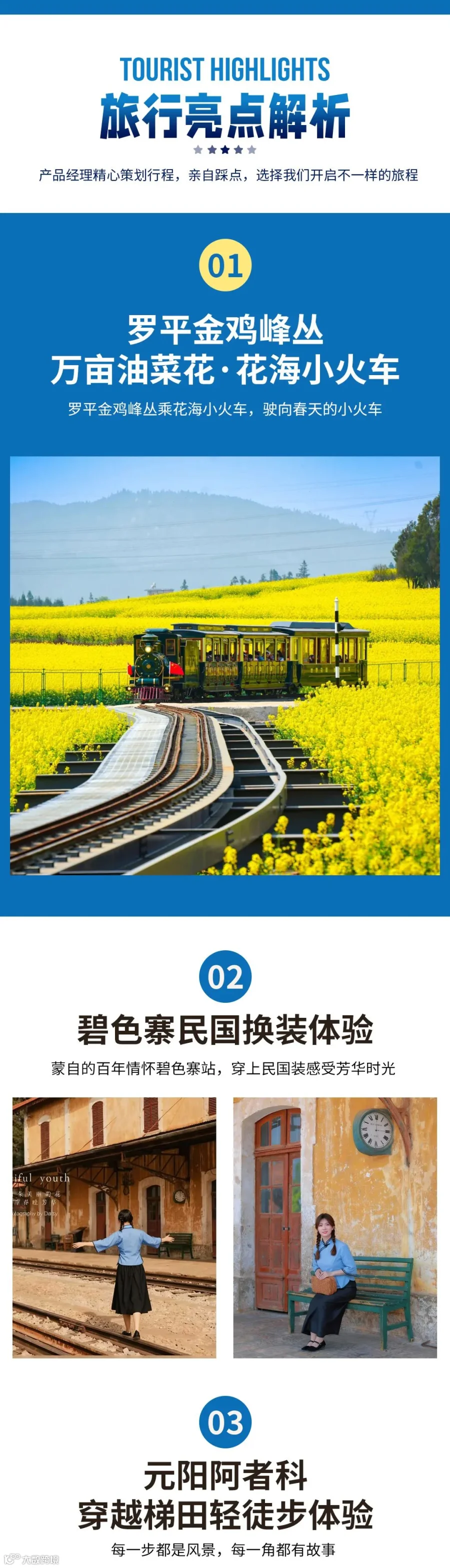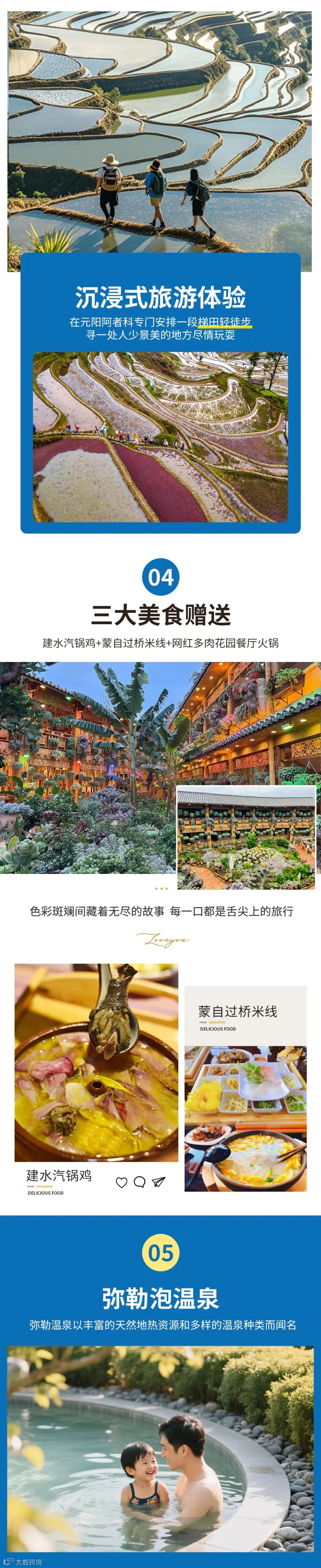 【超值体验】①罗平金鸡峰丛乘花海小火车;②元阳阿者科穿越梯田轻徒步;③碧色寨民国装换装;④九龙瀑布乘电动水上竹筏体验;⑤弥勒泡温泉;⑥含必消景交往返电瓶车(东风韵+碧色寨);