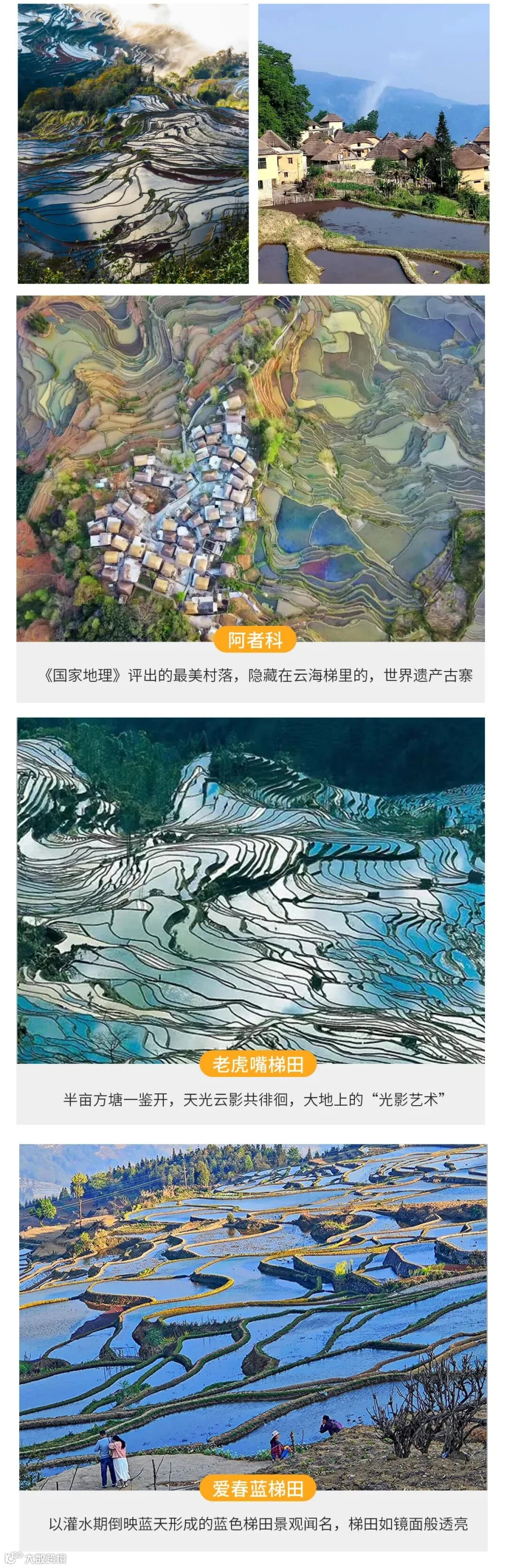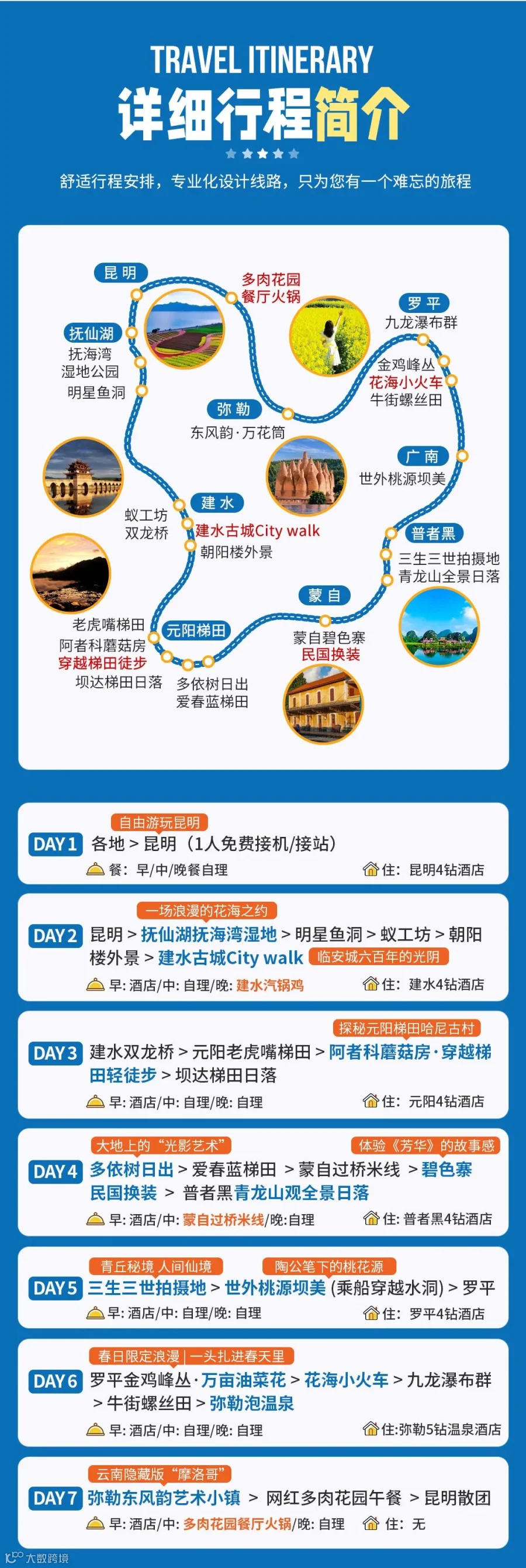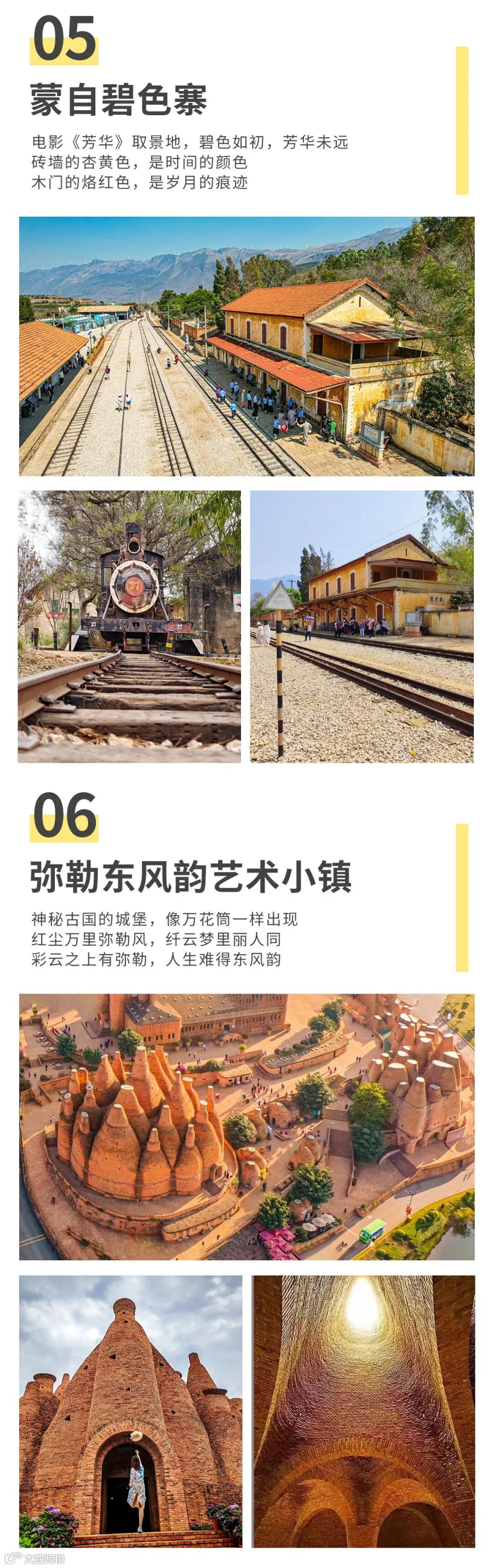 【超值体验】①罗平金鸡峰丛乘花海小火车;②元阳阿者科穿越梯田轻徒步;③碧色寨民国装换装;④九龙瀑布乘电动水上竹筏体验;⑤弥勒泡温泉;⑥含必消景交往返电瓶车(东风韵+碧色寨);