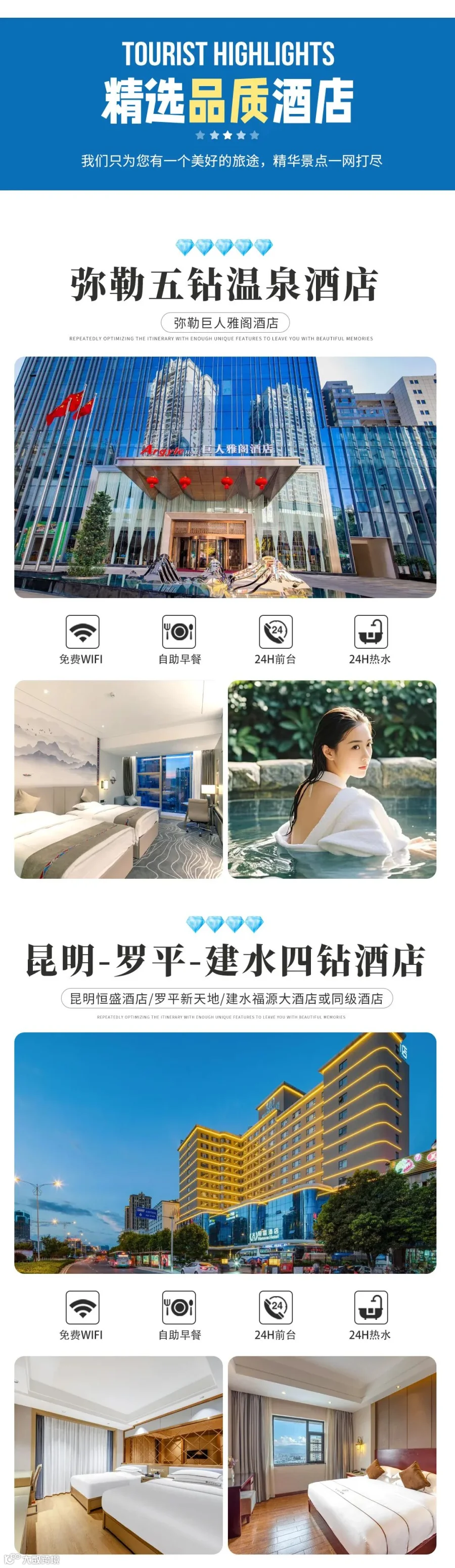 3、住宿:全程1晚5钻酒店+5晚4钻酒店(昆明4钻酒店、建水4钻酒店、元阳4钻酒店、普者黑4钻酒店、罗平4钻酒店、弥勒5钻温泉酒店)