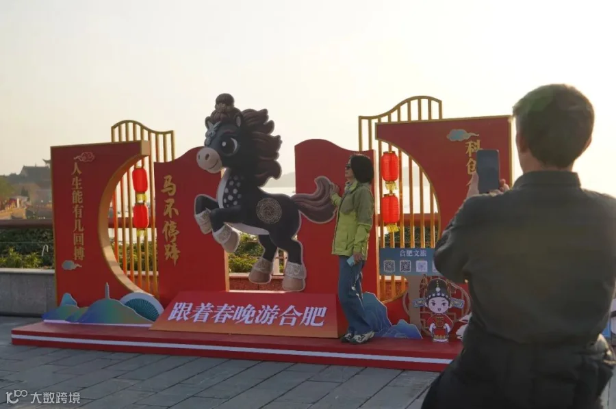 往湖边走去,视野豁然开朗。一处精心设计的打卡背景装置,将“科创合肥欢迎您”“跟着春晚游合肥”的字样与吉祥物“骐骐”的原型巧妙融合。远处是烟波浩渺的巢湖,近处是红火喜庆的春晚元素,传统与现代、自然与人文在此刻交织,提前上演着合肥作为春晚分会场的“高光时刻”。