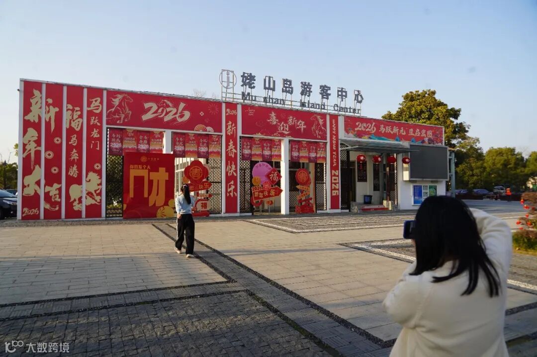 姥山岛游客中心的一整面外墙被喜庆的红色铺满。“马跃龙门”“福马奔腾”“马到功成”……一个个与马相关的吉祥词语如瀑布般倾泻而下,仿佛把对新一年的所有祝福都写在了墙上。地上,错落有致地立着“2026新年快乐”的打卡装置,无论站在哪个角度,随手一拍,都能定格一张年味十足的“人生照片”。